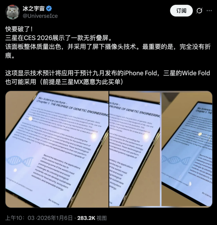 可靠的爆料机构Ice Universe今晚发布推文,展示了三星向2026年拉斯维加斯CES展会参与者展示的全新折叠屏。这款屏幕如此重要的是它不会出现折痕,而折痕正是当今折叠手机面临的最大问题之一。泄密者表示该面板整体质量“非常出色”,并注意到它采用了屏幕下摄像头技术。